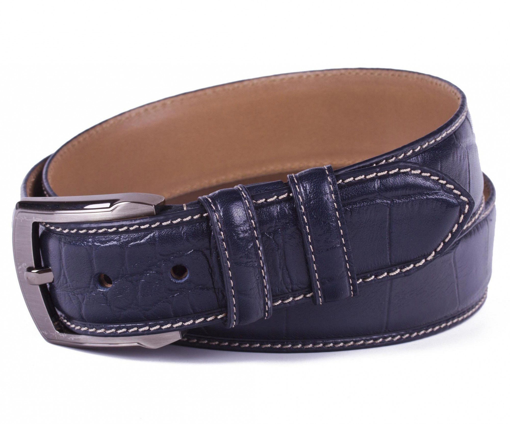 Классический кожаный мужской ремень синего цвета выполнен из натуральной телячей кожи.
