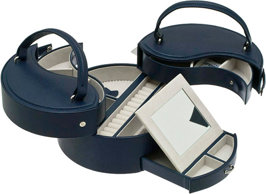 Раздвижная шкатулка для украшений. Внутри верхнего уровня - 6 отделений для ювелирных украшений, на нижнем уровне - валики для колец и отделения для украшений. Выдвижное отделение с зеркалом и дополнительными отделениями. Внутренняя отделка - полиэстер.