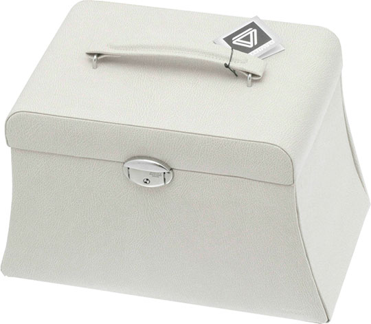 Шкатулка для хранения украшений. Внутри: 6 боковых выдвижных отсеков, держатели для колец и отделения для украшений. На верхней крышке зеркало и держатели под серьги. Внутренняя отделка - полиэстер. Закрывается на ключ.