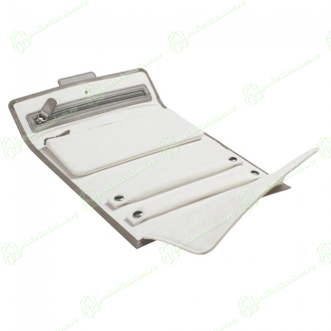 Ювелирный ролл для драгоценностей из натуральной кожи нежно-кремового цвета. Прекрасная внутренняя отделка из белого велюра. Два просторных отделения, запирающихся на молнию, два валика для крепления колец. Надежно запирается на клипсу.