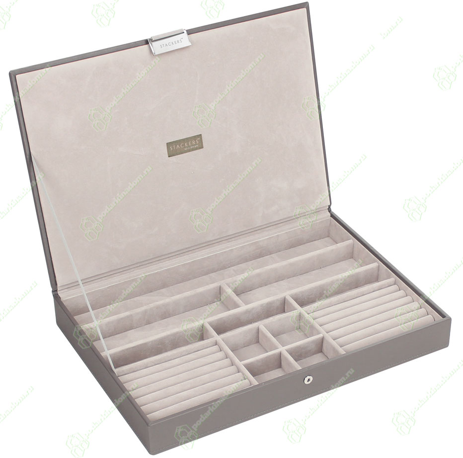 Одноуровневая шкатулка для драгоценностей серого цвета. Внешняя отделка выполнена из высококачественной экокожи. Внутренняя отделка из велюра светло-серого цвета. Два больших валика для серег и колец, четыре квадратных средних отделения, пять отделений различных размеров с перегородками, одно большое отделение для цепочек. Закрывается на кнопку.
