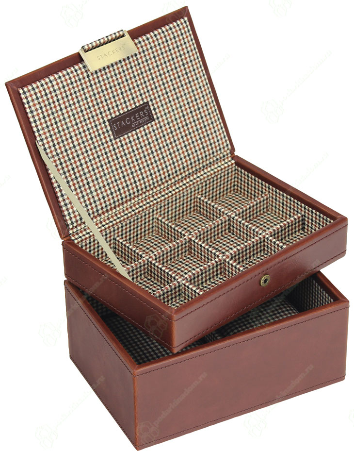Мужская шкатулка для запонок и часов кирпично-коричневого цвета. Внешняя отделка из высококачественной экокожи. Внутренняя отделка выполнена из хлопковой ткани с линейным рисунком. На верхней полке предусмотрены двенадцать отделений для хранения запонок, колец или цепочек. Нижняя вместительная полка с двумя большими подушками для хранения часов. Верхняя полка шкатулки закрывается на клипсу с логотипом Stackers.