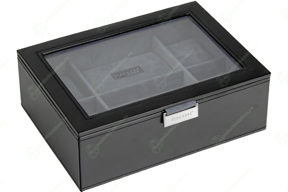Элегантная шкатулка с отделкой из натуральной черной кожи, прозрачной вставкой в крышке и магнитным замком. Шесть отделений предназначены для хранения часов или запонок. Внутренняя отделка из бархата благородного голубого оттенка. Благодаря прозрачной крышке вам не нужно открывать шкатулку, чтобы увидеть содержимое.