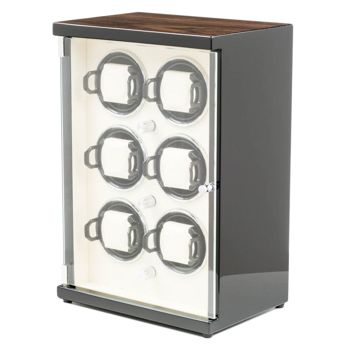 Шкатулка для подзавода 6 наручных часов. Корпус из дерева покрыт глянцевым лаком, внутри шкатулка отделана кожей.