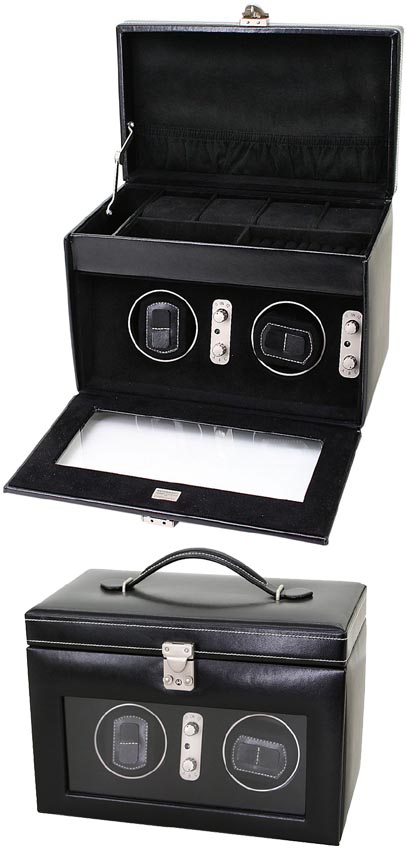 Система подзавода на 2 часов со стеклянной крышкой, от Champ-Collection (Германия). 4 дополнительных отделения для часов, работающих на батарейках, 2-ое небольшое отделение для бижутерии, один держатель для колец.