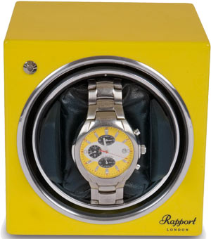Модуль Rapport для подзавода одних механических часов с автоподзаводом. Механизм шкатулки расположен в хромированной сфере на пьедестале из дерева, покрытого глянцевым лаком