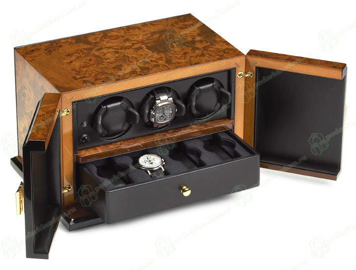 Деревянная шкатулка для подзавода трех часов и отделением для хранения 4 часов