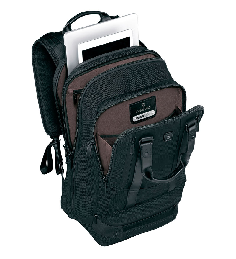 Мягкое отделение вмещает ноутбук диагональю до 17’’ / 43 см, оснащено блокируемыми бегунками застёжек-молний и имеет разработанную в Швейцарии систему для защиты содержимого, выполненную из сверхпрочных волокон Lanidur