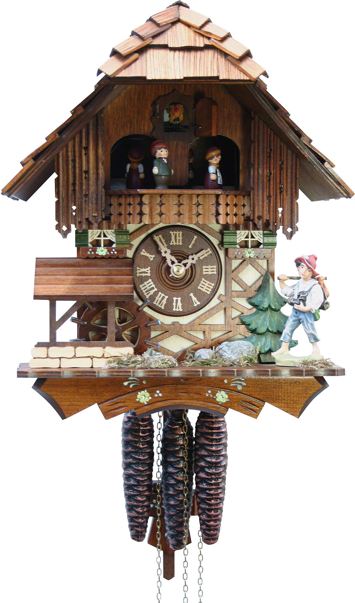 Механические музыкальные часы с кукушкой. Ручная работа. Запас хода — 1 день. Подвижные фигурки танцоров, фигурка мальчика, ручная роспись, крыша черепица, колесо мельницы крутится каждый час.