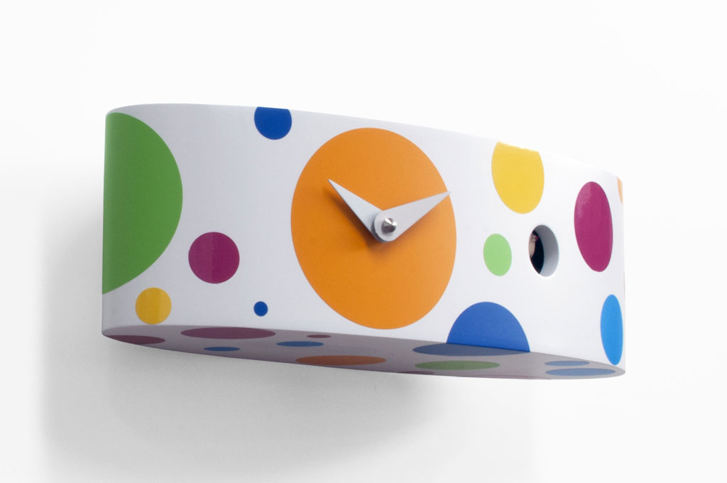 Часы эллиптической формы, изготовлены из дерева, в двух версиях: одна с оранжевым маятником с-образной формы, другая без маятника с белой нижней частью с множеством разноцветных кругов разного радиуса. Батареи кварцевый механизм. Кукушка имеет встроенный датчик ночного режима и автоматически выключается с наступлением темноты.
