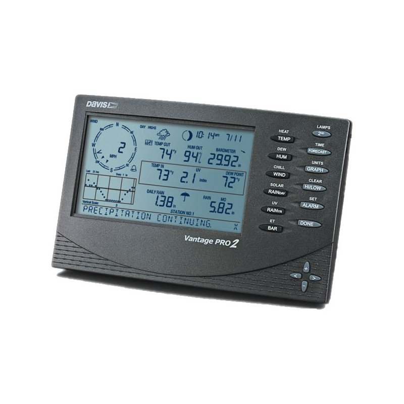 Консоль управления беспроводной метеостанции Vantage Pro2 получает данные от блока внешних датчиков ISS, обрабатывает и отображает эти данные на дисплее консоли управления (Davis 6312EU).